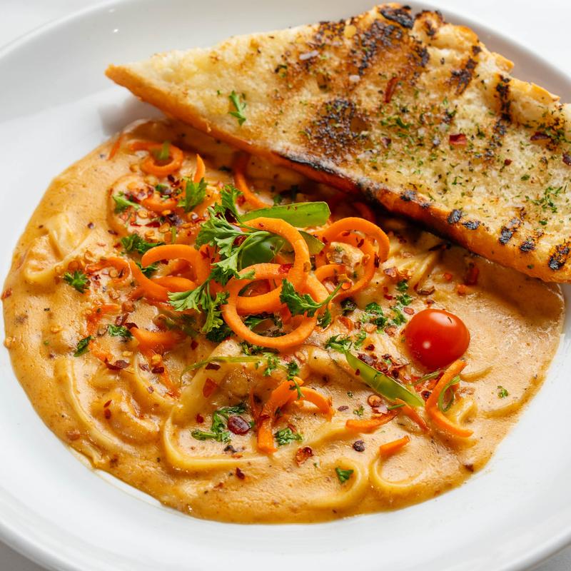 Blackened shrimp, spicy alfredo sauce, fettuccine pasta served with garlic bread.