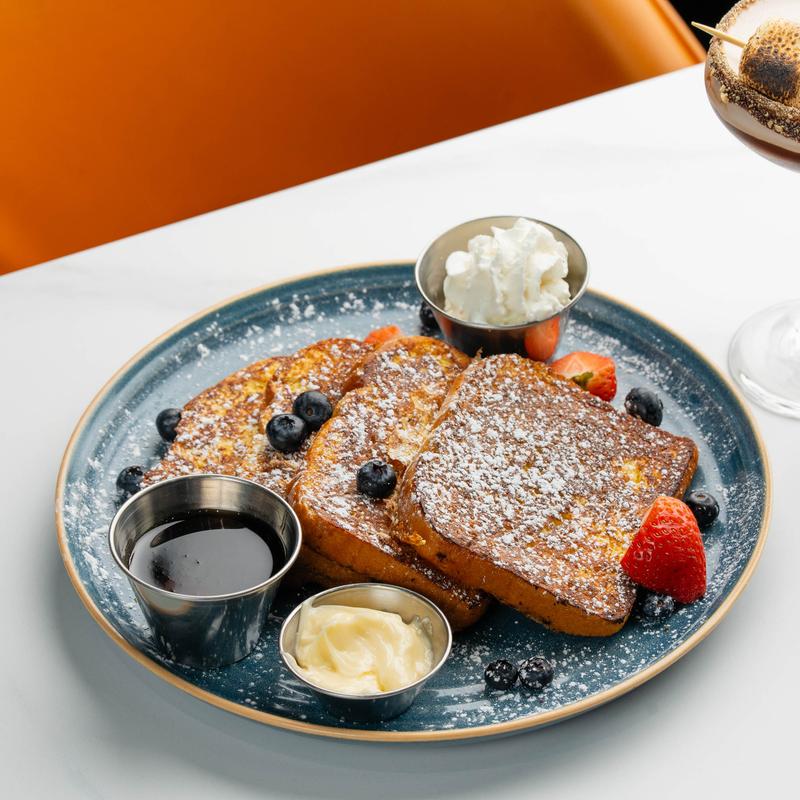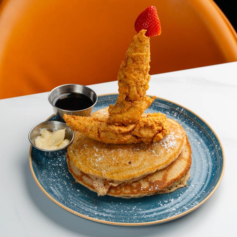 Two buttermilk pancakes, honey butter, berries, & maple syrup topped with chicken tenders.