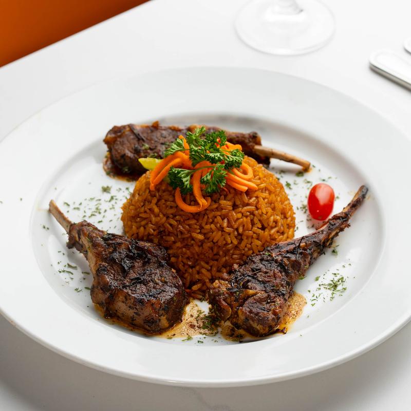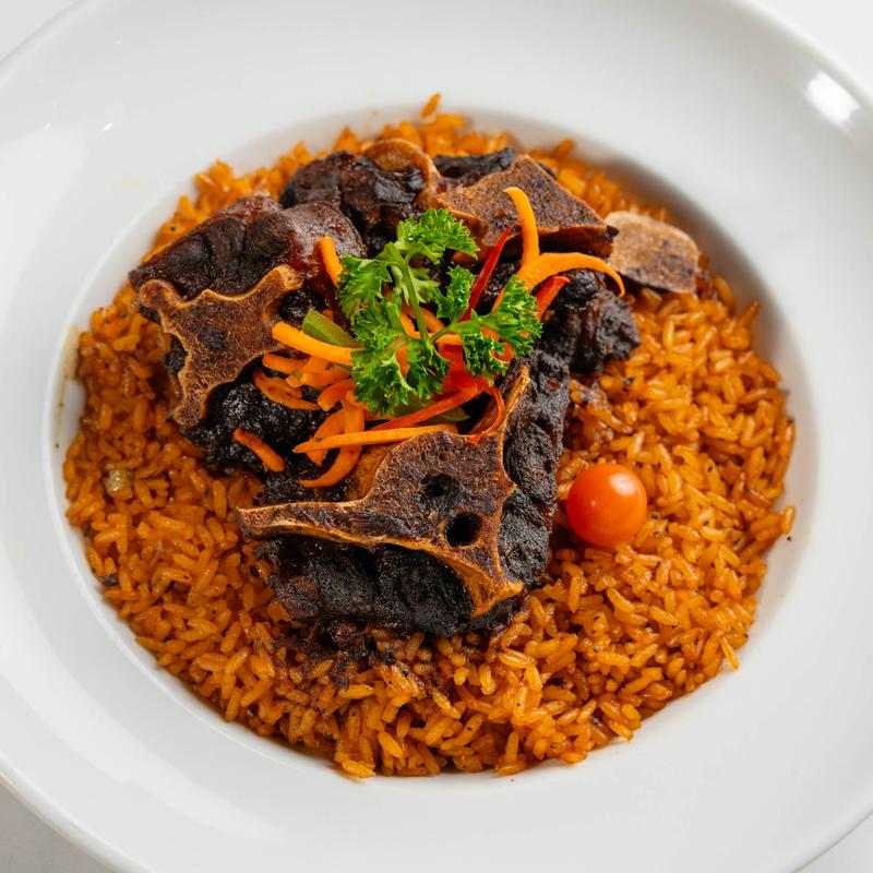 Beef suya & sauteed onions with a sprinkle of suya spice and jollof rice.
