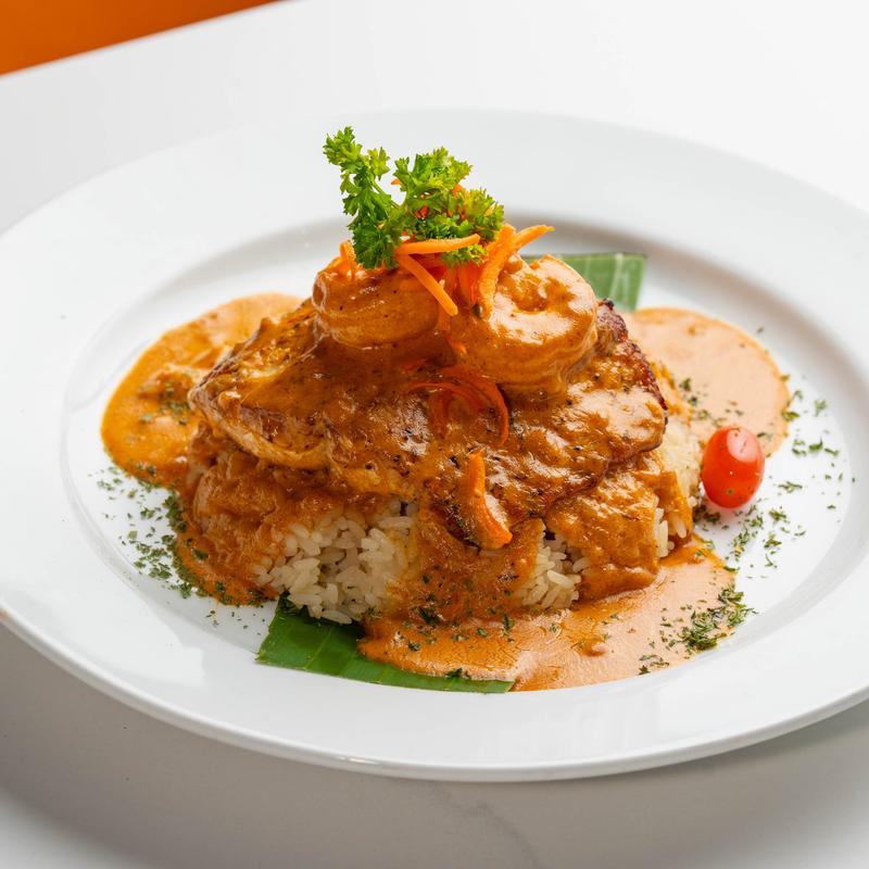 Grilled salmon fillet crowned with two tender poached shrimp finished with a rich velvety cream sauce. Served with coconut rice.