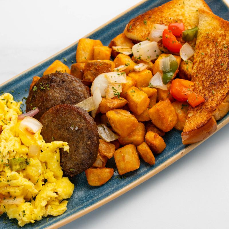 Two eggs your way, your choice of country sausage or ham steak, breakfast potatoes & peppers, with buttery Texas toast.