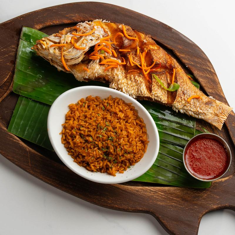 Herb-roasted snapper with jollof rice, spicy chili sauce, or asun sauce.