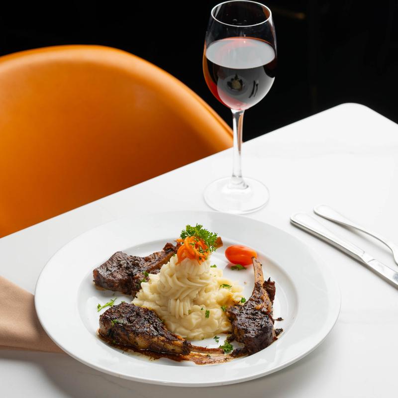 Hand-cut lamb chops with potato mash, & a house glaze sauce.