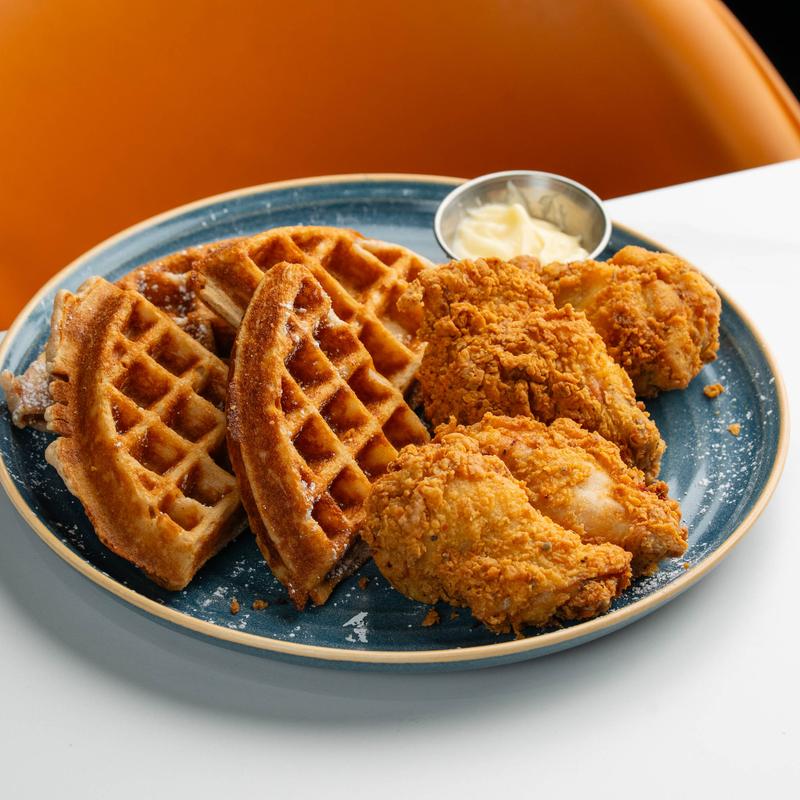 Belgian waffle with crispy wings served with honey butter and syrup.