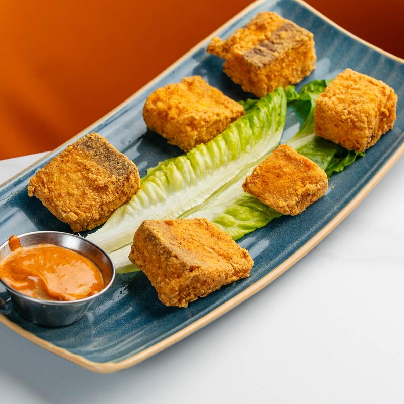 Salmon is deep-fried until golden brown. Served with Sriracha mayo.